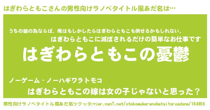 | 女子向けラノベタイトル風あだ名 | 『(仮)はぎわらともこのやんごとなき事情』 |