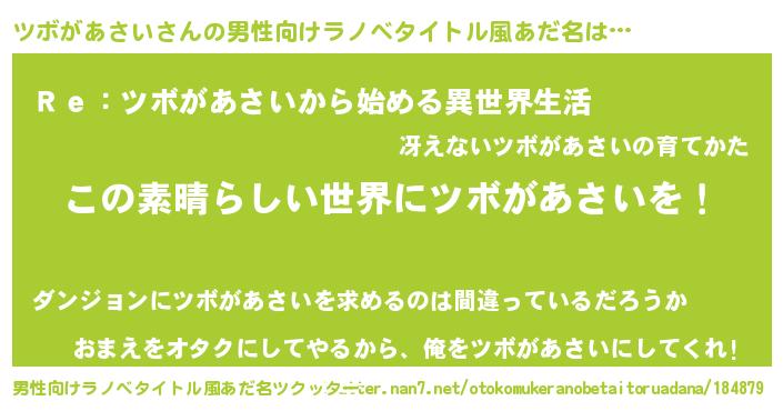 胡散臭い通販商品みたいなあだ名 | 『あなたにだけ特別に提供する限定10本のレアな日本酒…その名も「ツボがあさい」』 |
