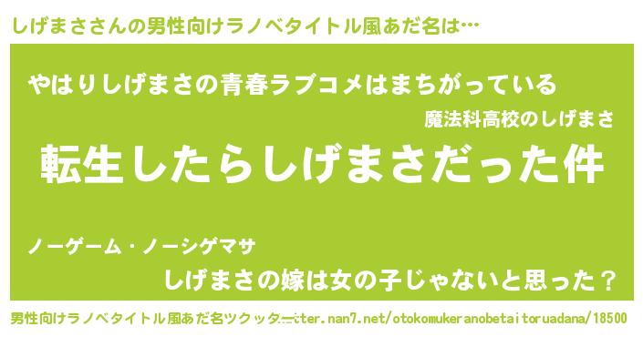 | 女子向けラノベタイトル風あだ名 | 『しげまさの玉の輿計画!』 |