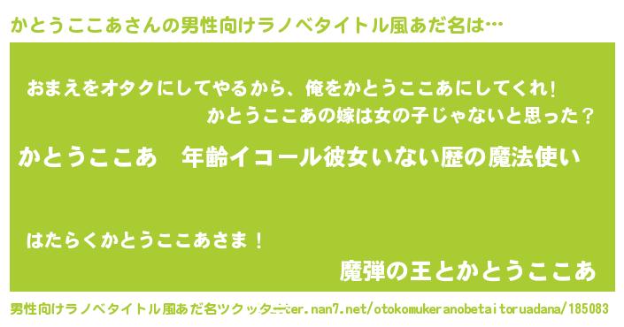 | 女子向けラノベタイトル風あだ名 | 『かとうここあの玉の輿計画!』 |