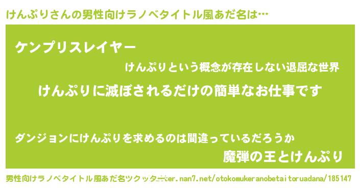 | 胡散臭い通販商品みたいなあだ名 | 『あなたにだけ特別に提供する100年もののヴィンテージワイン…その名も「けんぷり」』 |