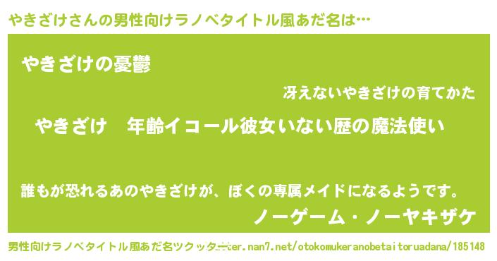 | 女子向けラノベタイトル風あだ名 | 『やきざけの玉の輿計画!』 |