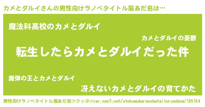 | 女子向けラノベタイトル風あだ名 | 『婚約破棄系悪役カメとダルイに転生したので、保身に走りました。』 |