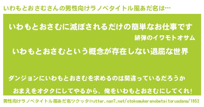 | 女子向けラノベタイトル風あだ名 | 『異世界で失敗しない100のいわもとおさむ』 |