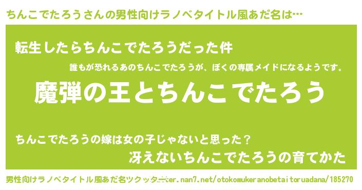 | 女子向けラノベタイトル風あだ名 | 『乙女ゲームの破滅フラグしかない悪役ちんこでたろうに転生してしまった…』 |