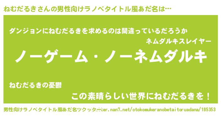 | 女子向けラノベタイトル風あだ名 | 『死神ねむだるきの再婚』 |