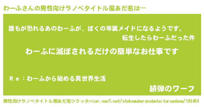 | 胡散臭い通販商品みたいなあだ名 | 『来世でも幸せになれる健康食品…その名も「わーふ」』 |