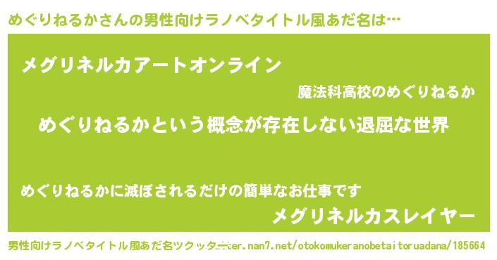 | 女子向けラノベタイトル風あだ名 | 『異世界で失敗しない100のめぐりねるか』 |