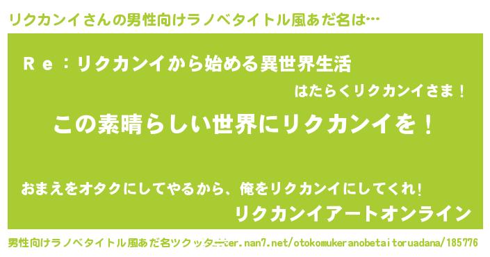 | 女子向けラノベタイトル風あだ名 | 『悪役リクカンイに転生したようですが、知った事ではありません』 |