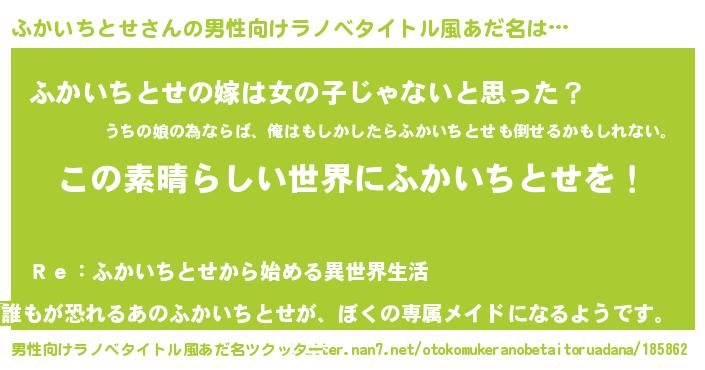 | 女子向けラノベタイトル風あだ名 | 『乙女ゲームの破滅フラグしかない悪役ふかいちとせに転生してしまった…』 |