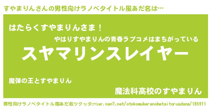 | 女子向けラノベタイトル風あだ名 | 『婚約破棄系悪役すやまりんに転生したので、保身に走りました。』 |