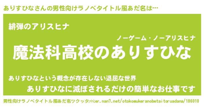 | 女子向けラノベタイトル風あだ名 | 『ありすひななんてお断りですっ。』 |