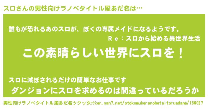 | 胡散臭い通販商品みたいなあだ名 | 『あなたにだけ特別に提供する100年もののヴィンテージワイン…その名も「スロ」』 |