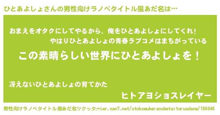 | 胡散臭い通販商品みたいなあだ名 | 『世界中を虜にした100年もののヴィンテージワイン…その名も「ひとあよしょ」』 |