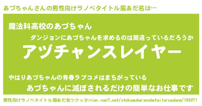 あづちゃんさんの男性向けラノベタイトル風あだ名をツクッター!
