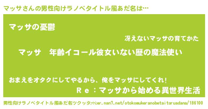 | 女子向けラノベタイトル風あだ名 | 『マッサの玉の輿計画!』『マッサ恋絵巻』 |