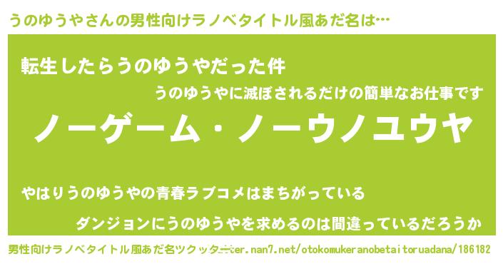 | 女子向けラノベタイトル風あだ名 | 『死神うのゆうやの再婚』 |