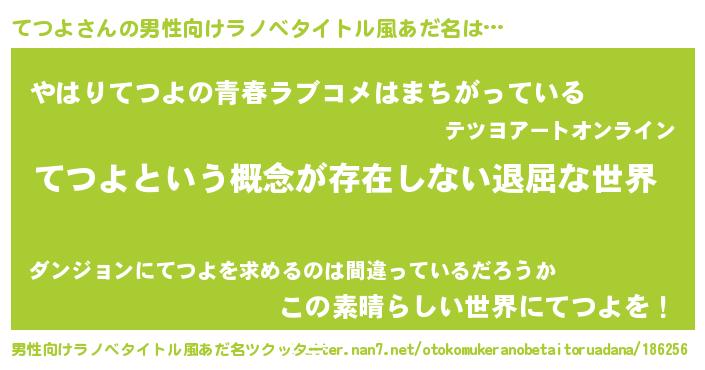 | 女子向けラノベタイトル風あだ名 | 『てつよの契約王妃』『てつよ伯爵の花嫁』 |