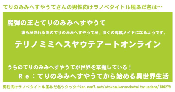 | 女子向けラノベタイトル風あだ名 | 『てりのみみへすやうて姫と円卓の騎士』 |
