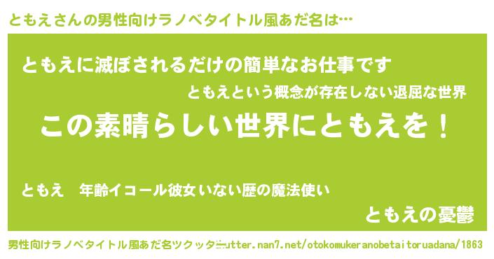 | 女子向けラノベタイトル風あだ名 | 『乙女ゲームの破滅フラグしかない悪役ともえに転生してしまった…』 |