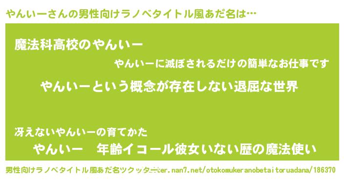 | 女子向けラノベタイトル風あだ名 | 『異世界で失敗しない100のやんいー』 |