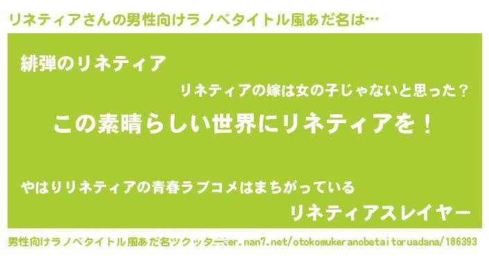 | 意味不明あだ名 | 『住所不定無職リネティア(40歳)』 |