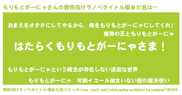 | 胡散臭い通販商品みたいなあだ名 | 『100人中100人が認めた隕石のかけら…その名も「もりもとがーにゃ」』 |