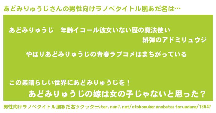 | 女子向けラノベタイトル風あだ名 | 『あどみりゅうじの雑貨屋さん』 |