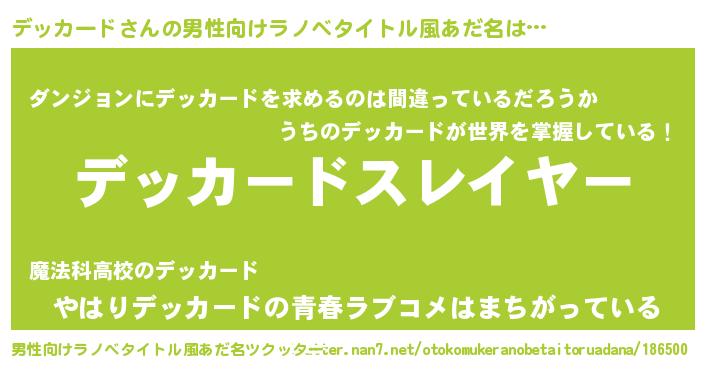| 女子向けラノベタイトル風あだ名 | 『婚約破棄系悪役デッカードに転生したので、保身に走りました。』 |