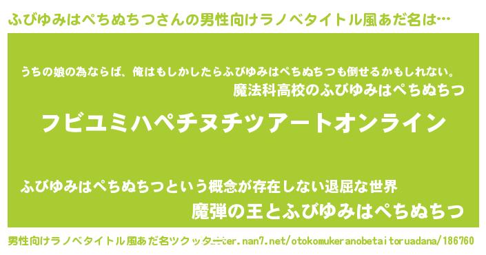 | 胡散臭い通販商品みたいなあだ名 | 『億万長者になれる水晶球…その名も「ふびゆみはぺちぬちつ」』 |