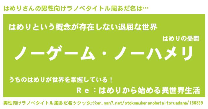 | 女子向けラノベタイトル風あだ名 | 『死神はめりの再婚』『はめりの契約王妃』 |