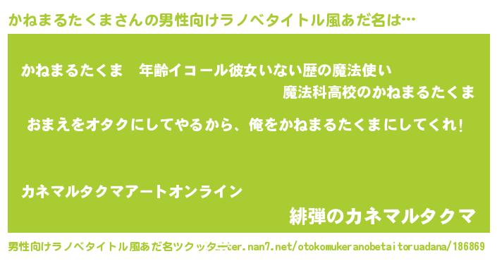 | 女子向けラノベタイトル風あだ名 | 『かねまるたくま夫妻のなれそめ』 |
