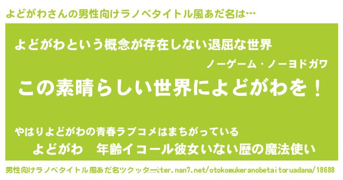 | 女子向けラノベタイトル風あだ名 | 『悪役よどがわに転生したようですが、知った事ではありません』 |
