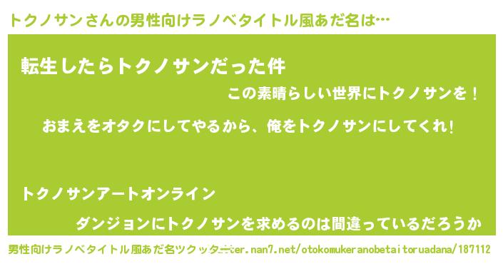 | 女子向けラノベタイトル風あだ名 | 『トクノサン夫妻のなれそめ』 |