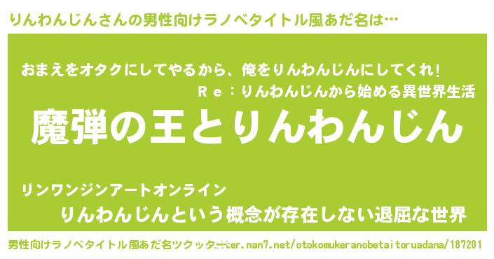| 女子向けラノベタイトル風あだ名 | 『りんわんじんが死なない童話 林檎のりんわんじんの診療簿』 |