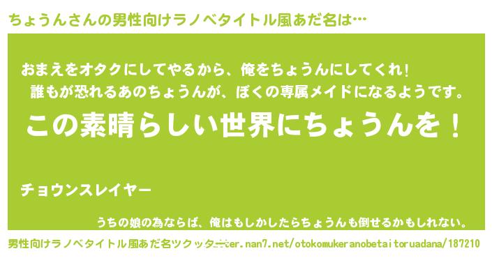 | 胡散臭い通販商品みたいなあだ名 | 『あなたにだけ特別に提供する世界で10本だけ現存している希少なブランデー…その名も「ちょうん」』 |