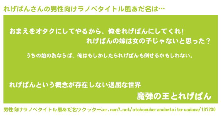 | 女子向けラノベタイトル風あだ名 | 『れげぱんの婚約者』『れげぱん恋絵巻』 |