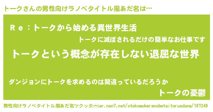 | 女子向けラノベタイトル風あだ名 | 『トークの契約王妃』『闇のトーク』 |