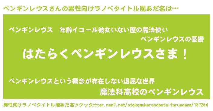 | 女子向けラノベタイトル風あだ名 | 『首の姫と首なしペンギンレウス』 |