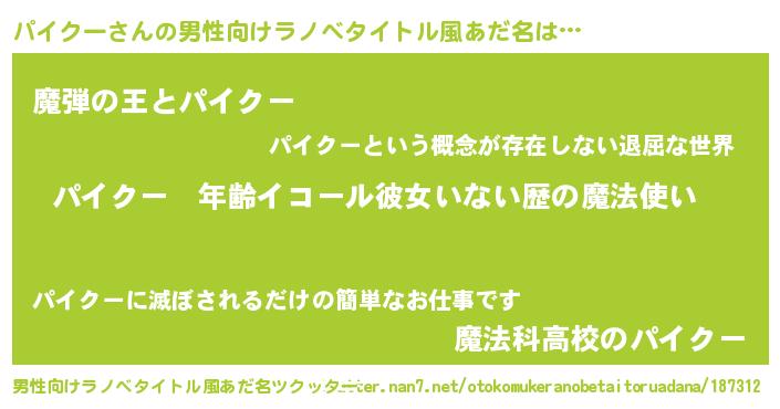 | 女子向けラノベタイトル風あだ名 | 『パイクーの玉の輿計画!』 |