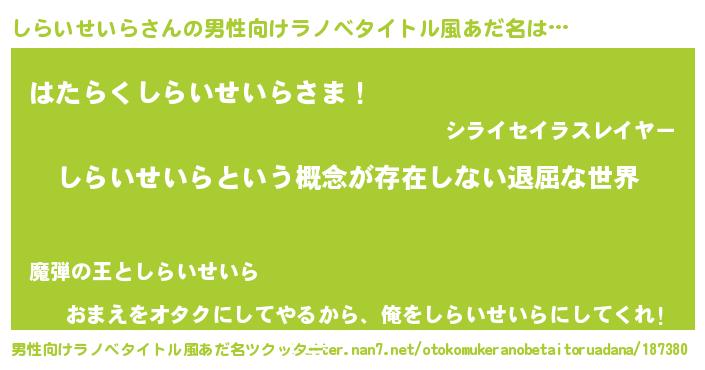 | 女子向けラノベタイトル風あだ名 | 『異世界で失敗しない100のしらいせいら』 |