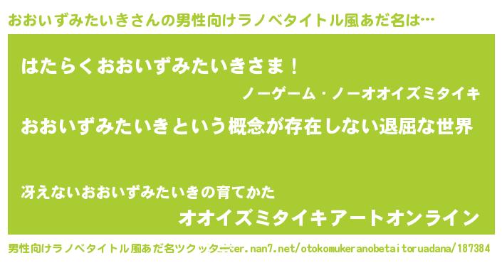 | 女子向けラノベタイトル風あだ名 | 『異世界で失敗しない100のおおいずみたいき』 |