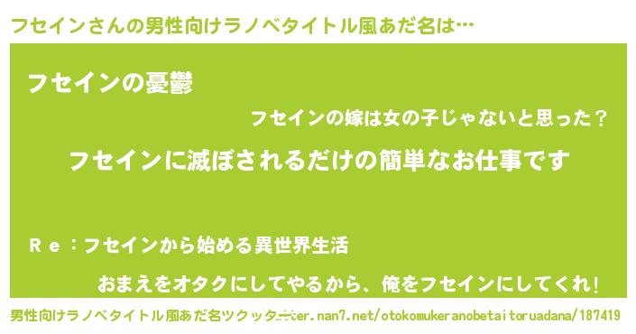| 女子向けラノベタイトル風あだ名 | 『横柄フセインと宰相陛下』 |