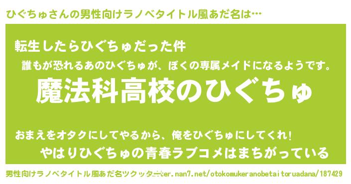 | 意味不明あだ名 | 『自称ひぐちゅ』『もやし科ひぐちゅ属』 |
