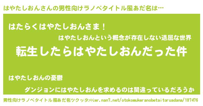 | 女子向けラノベタイトル風あだ名 | 『はやたしおんの玉の輿計画!』 |