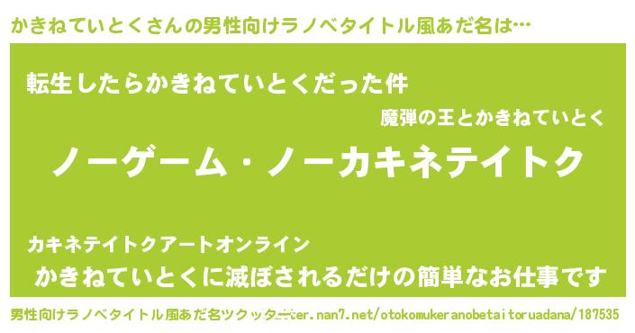 | 女子向けラノベタイトル風あだ名 | 『死神かきねていとくの再婚』 |