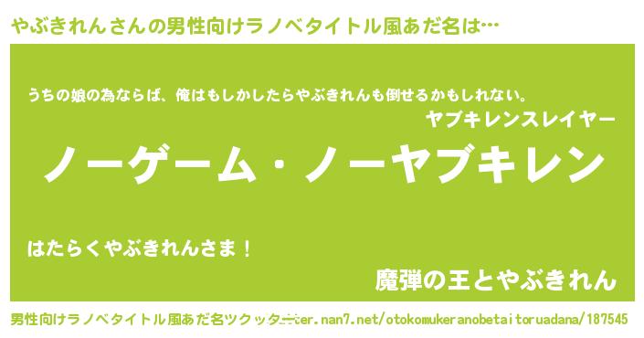 | 女子向けラノベタイトル風あだ名 | 『死神やぶきれんの再婚』 |