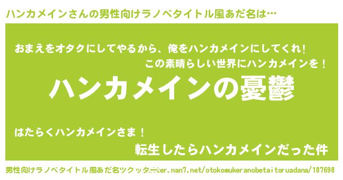 | 女子向けラノベタイトル風あだ名 | 『(仮)ハンカメインのやんごとなき事情』 |
