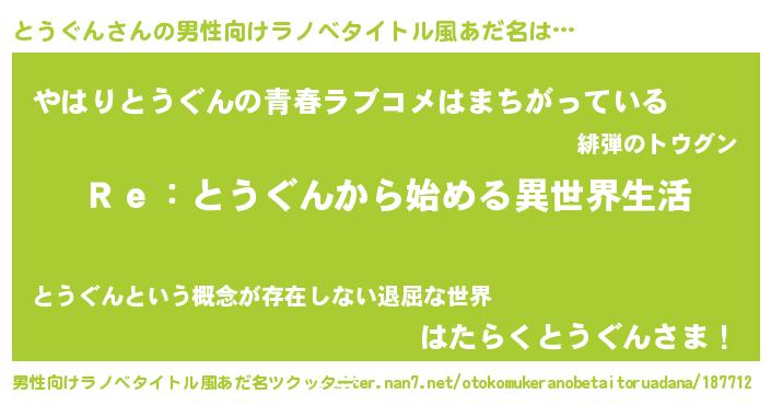 | 女子向けラノベタイトル風あだ名 | 『闇のとうぐん』『とうぐんの雑貨屋さん』 |