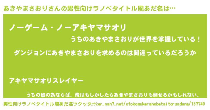 | 胡散臭い通販商品みたいなあだ名 | 『信頼と実績のサプリメント…その名も「あきやまさおり」』 |